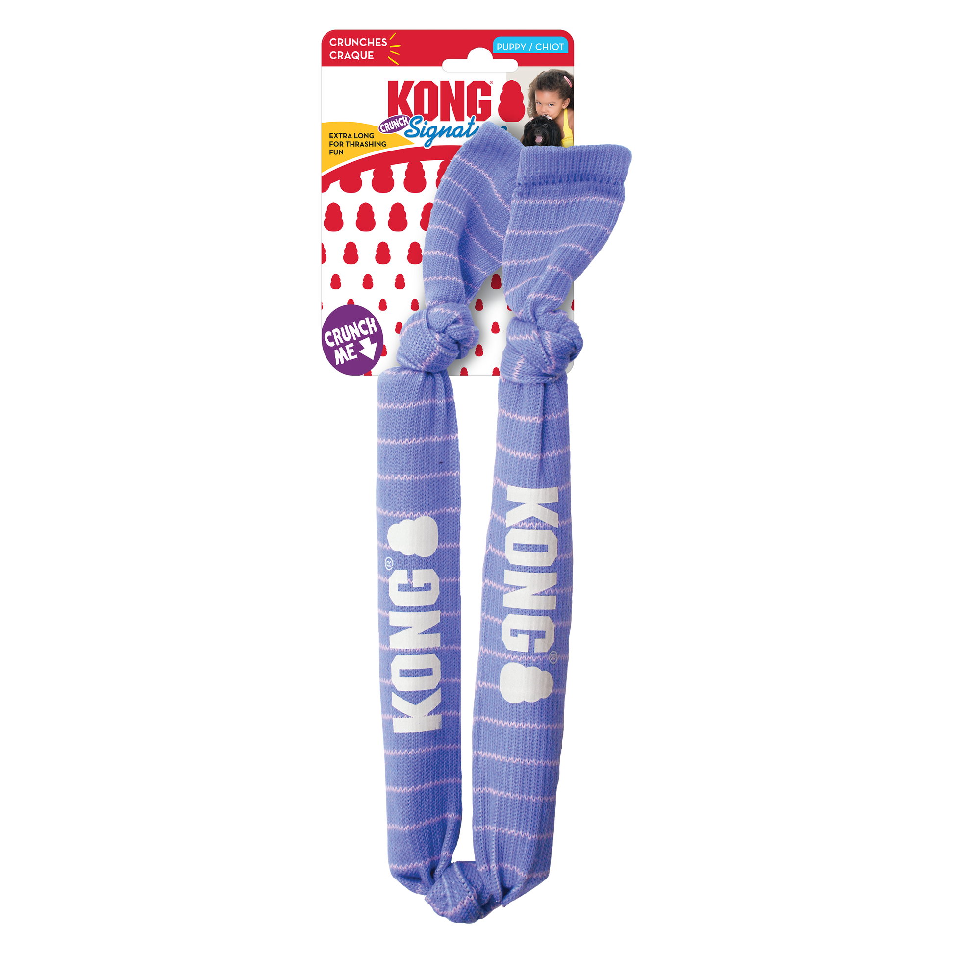 Les sons irrésistibles de KONG Signature Crunch Puppy mobilisent l’instinct joueur naturel des chiots qui se défoulent en tirant, en rapportant et en secouant le jouet. L’extérieur semblable à une chaussette permet une mastication douce et récompense des comportements convenables. Les nœuds maintiennent l’intérêt en offrant une autre expérience de mastication agréable. De plus, sa taille est idéale pour une partie de lutte entre deux chiens !