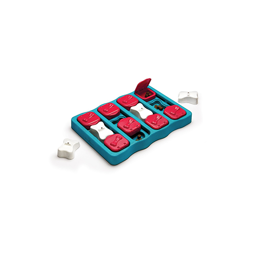 COMMENT JOUER : Placez des friandises ou des croquettes dans les compartiments de la base et des blocs coulissants. Couvrir les compartiments du milieu avec les os. Plus il y a de compartiments couverts, plus le puzzle sera difficile ! Que les jeux commencent! Montrez à votre chien comment fonctionne le jeu et encouragez-le à trouver les friandises. Les chiens sont plus intelligents que vous ne le pensez. Parfois, nous avons juste besoin de leur apprendre! Laissez quelques os de côté et ouvrez les blocs pour susciter l'intérêt de votre chien.
