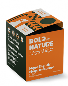 Mega Blend signifie Mega saveur. Nos galettes Bold by Nature Mega Blend sont le mélange de base parfait pour les repas de votre chien. Les galettes sont pleines de viande de poulet hachée, d'os hachés, d'organes de bœuf et de tripes. Ajoutez vos propres légumes ou suppléments pour un repas complet.